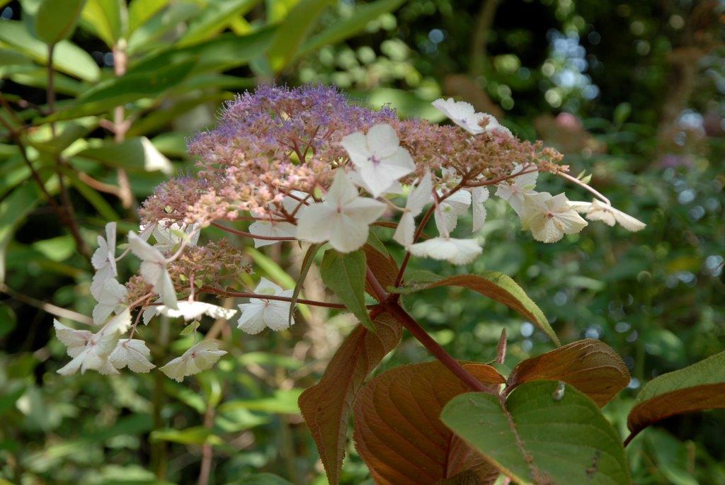 Les macrophylla (têtes rondes ou plates) sont à leur apogée tout au long de juillet, certains restant très décoratifs jusqu’aux gelées. Se remarque également la floraison immaculée, très graphique de l’opulent Hydrangea aspera from Gong Shan au beau feuillage caramel. En revanche il faut attendre la fin de l’été pour admirer celle, tout aussi surprenante, des H. strigosa notamment.